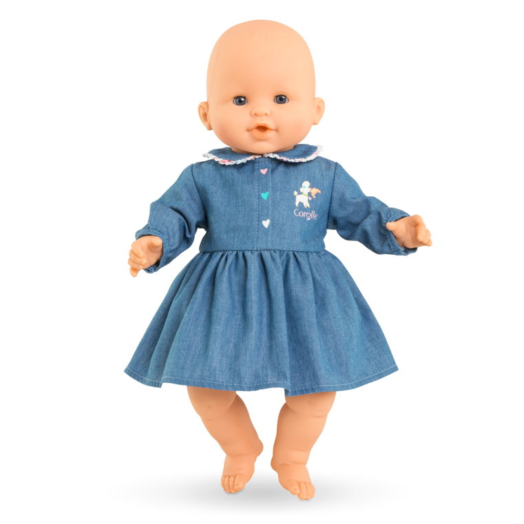 La Robe Week-end à Paris est idéale pour tous les grands poupons de 36 cm. Cette robe bleue, imitation denim, est ornée d'un joli col claudine bordé de volants imprimés dans le tissu exclusif de la collection Week-end à Paris. Sur la poitrine, une adorable sérigraphie de petit chien, accompagné du logo Corolle, apporte une note ludique à la tenue tandis que les petites broderies "boutons" en forme de coeurs colorés sur le devant accentuent le côté tendre et amusant de la robe.