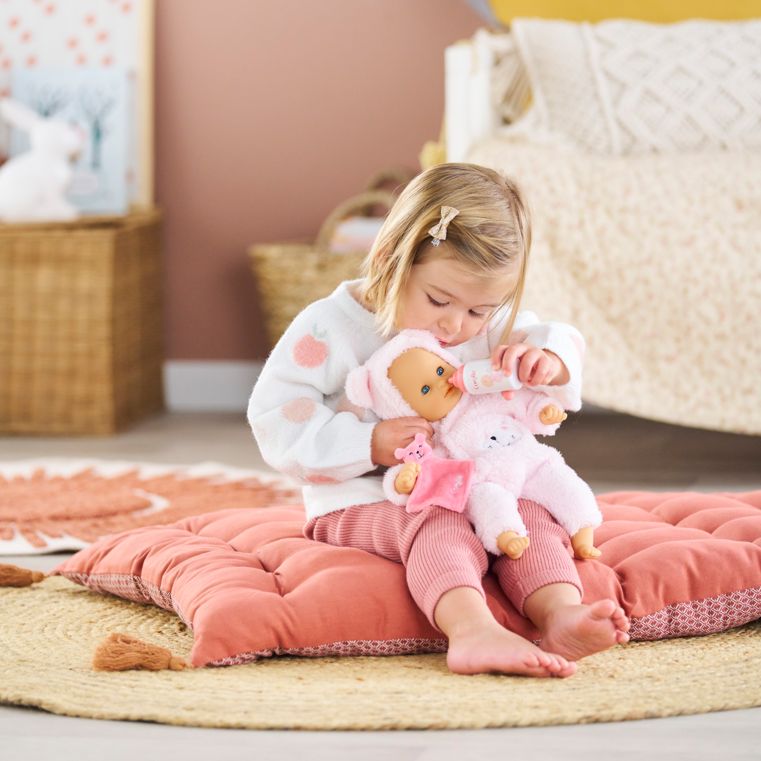 Sa taille est parfaitement adaptée aux petits bras des enfants. Son corps souple lui permet de prendre les mêmes positions qu'un vrai bébé. Son visage, ses bras et ses jambes, à la délicate senteur de vanille, sont en vinyle doux au toucher. Avec ses yeux dormeurs, il fait dodo quand on le couche sur le dos.
