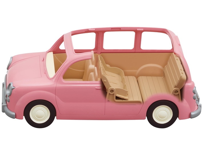 Emmène tes Sylvanian se balader et pique-niquer au milieu de la nature dans le monospace rose qui peut contenir jusqu'à 7 personnages. Le volant et les roues tournent. Le dos des banquettes se retourne et se transforme en sièges-auto pour assoir les bébés.
