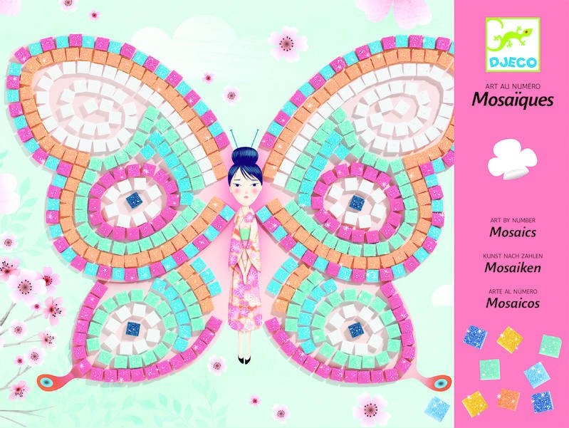 Dans cette pochette créative, Djeco vous propose de réaliser 2 magnifiques tableaux de mosaïques pailletées sur le thème des Papillons avec de petits carrés de mousse autocollants.