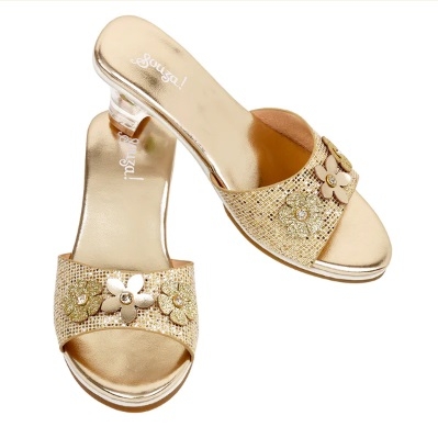 Ces mules dorées disposent de talons garnis de fleurs à l'intérieur et sont décorées de fleurs et de paillettes à l'avant.