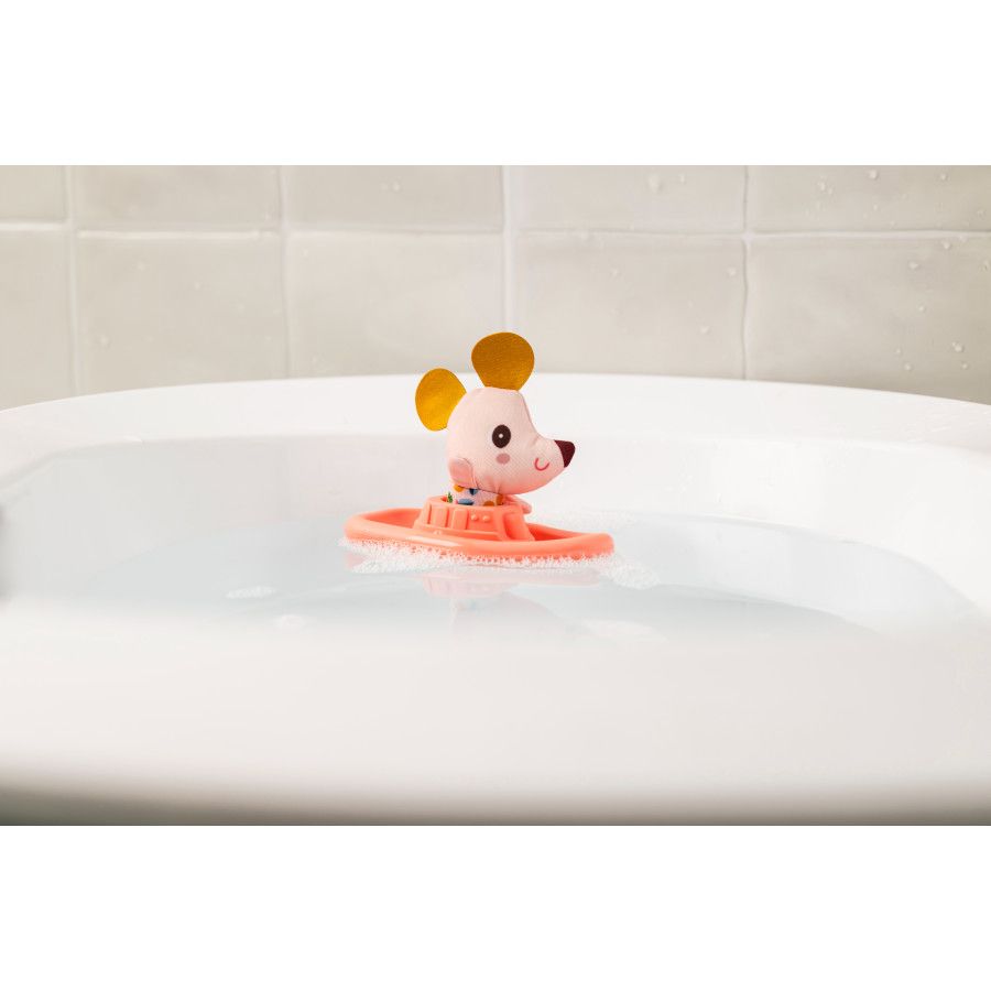 Avec son joli bateau rose flottant, Nina la souris accompagne bébé dans des moments de détente et de partage à l'heure du bain ! Adapté aux bébés dès 6 mois, ce jouet de bain permet de stimuler la vue, la motricité et l'imagination des tout-petits. La souris en tissu s'emboîte dans le bateau en silicone et se détache facilement.