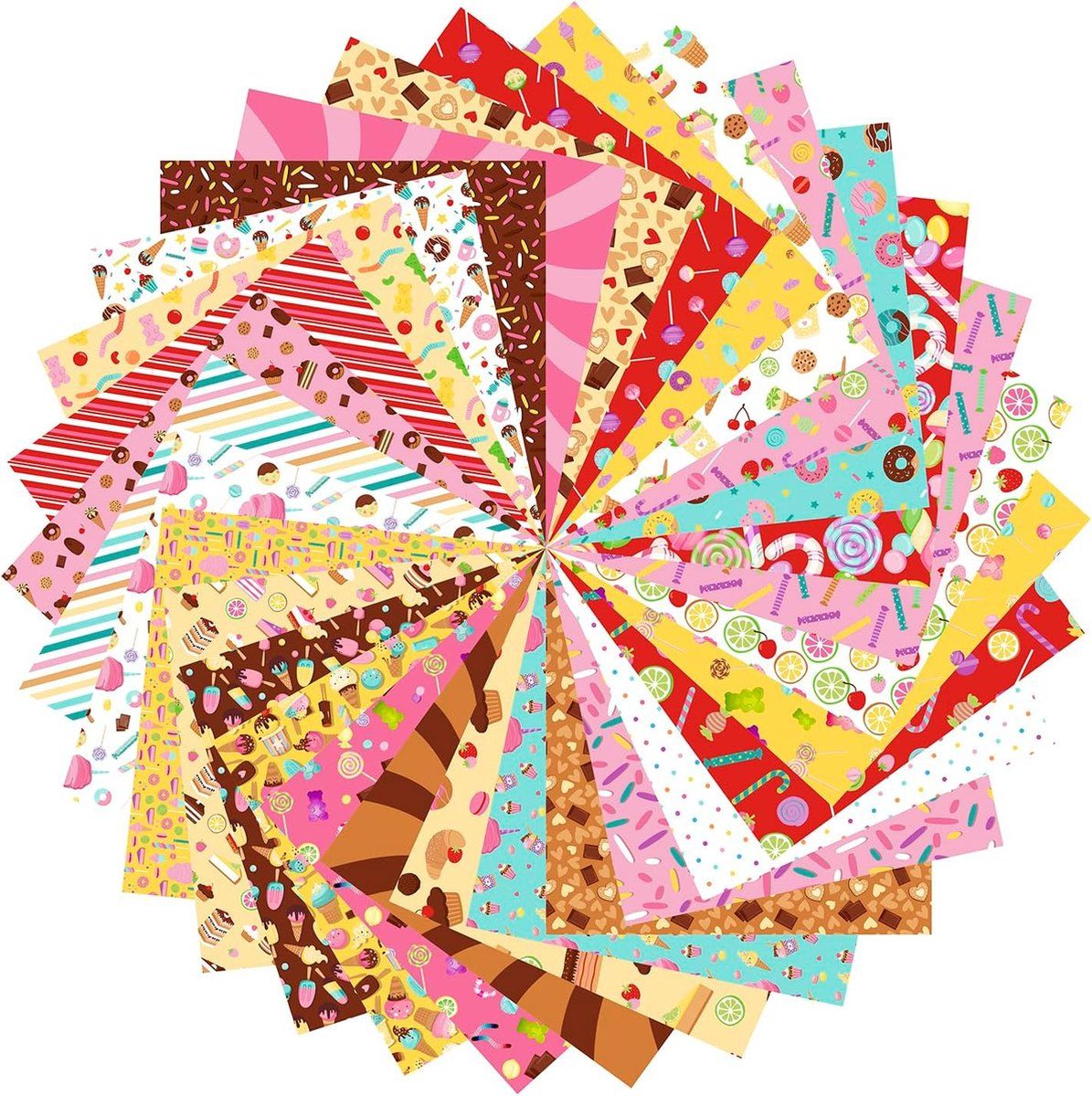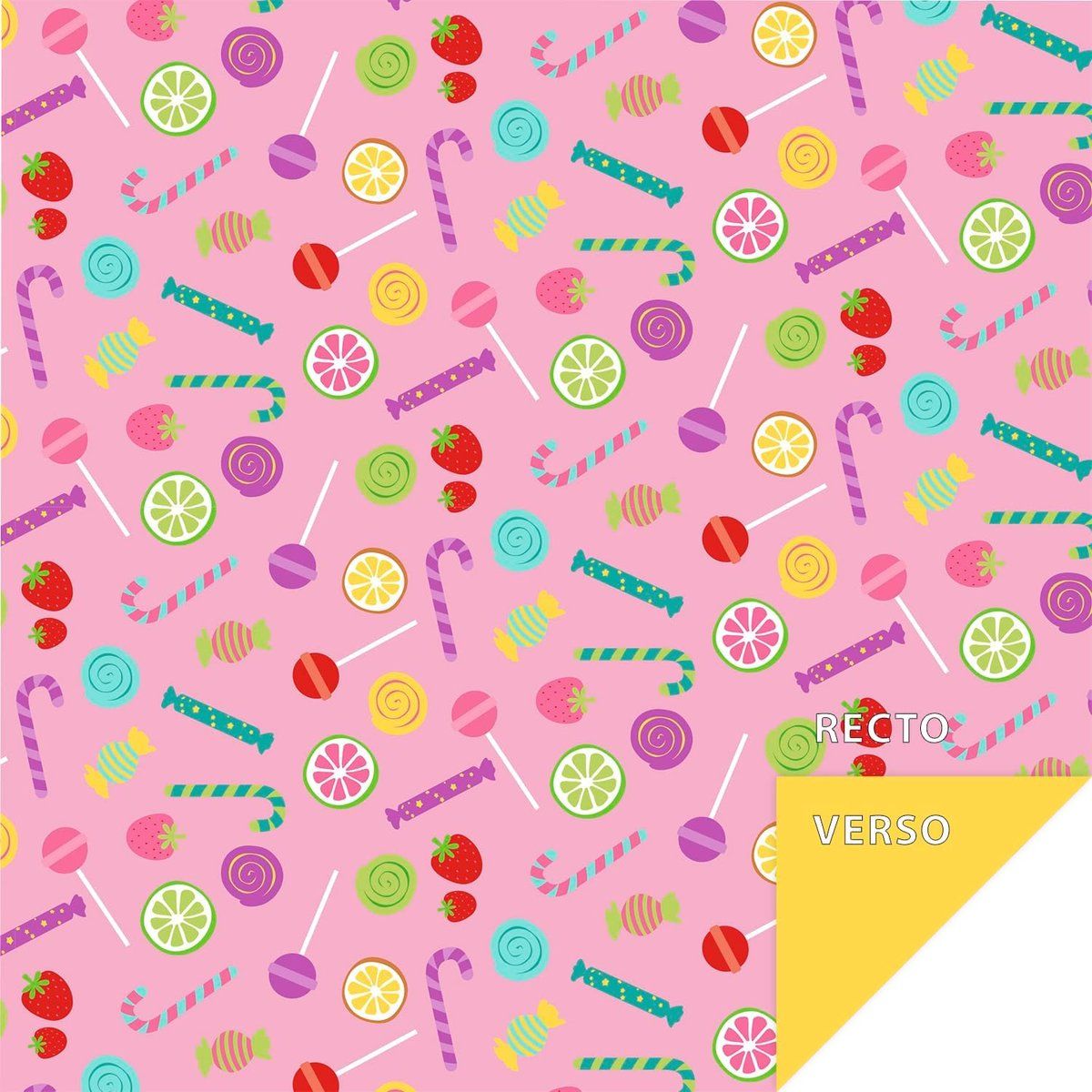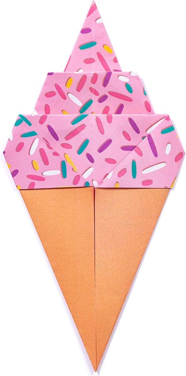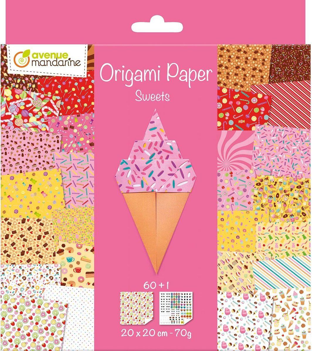 Un assortiment de 60 feuilles de papier origami imprimées recto-verso de 20x20 cm aux motifs amusants de bonbons, ainsi qu'une planche d'yeux autocollants.