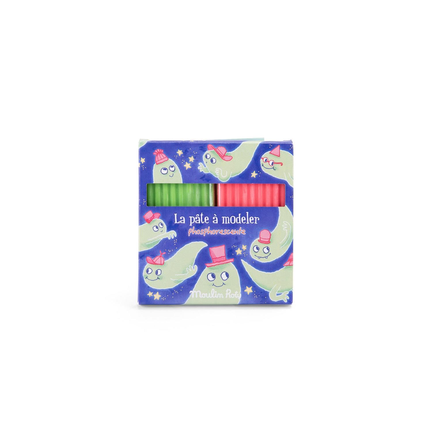 2 pâtes à modeler rose et verte phosphorescentes de la collection Les petites merveilles de Moulin Roty avec lesquelles on peut sculpter des formes éblouissantes !