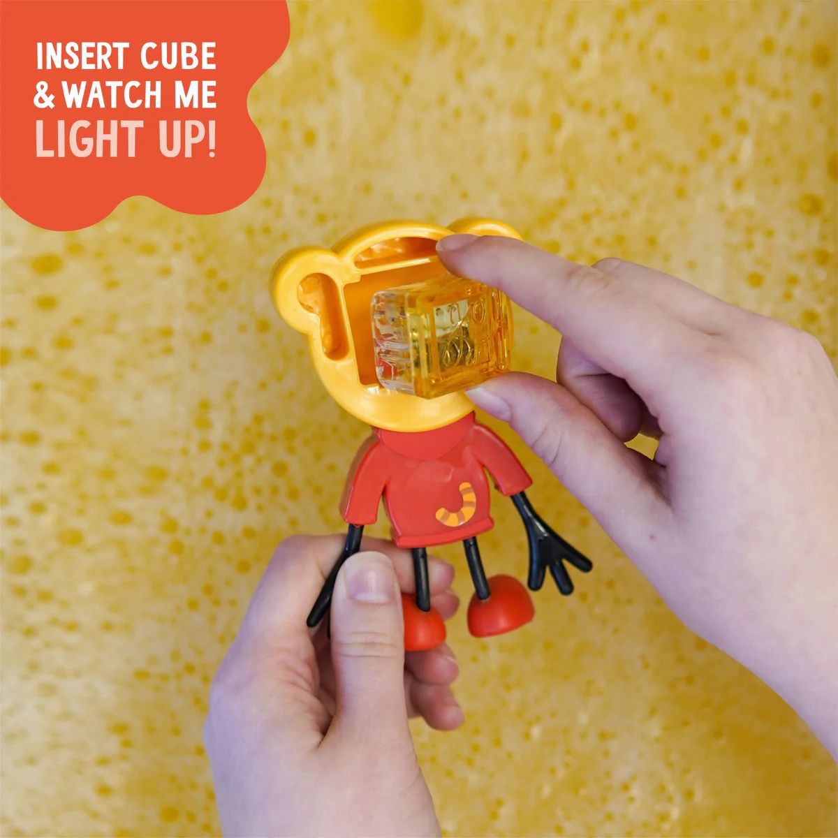 Comment? Insérez votre cube lumineux Glo Pals à l'arrière du personnage, plongez-le dans l'eau et regardez-le s'illuminer !