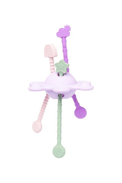 Sa matière souple, sa taille et sa forme ergonomique permettent une bonne prise en main. Bébé pourra soulager ses gencives lors des poussées dentaires grâce aux différents éléments texturés. Chaque corde est dotée d'un motif cranté différent afin de créer des sensations variées de son et de vibration lorsque bébé tirera dessus. Il pourra également développer son habileté à contrôler ses mouvements et à effectuer de petits gestes précis grâce au bulles "pop".
