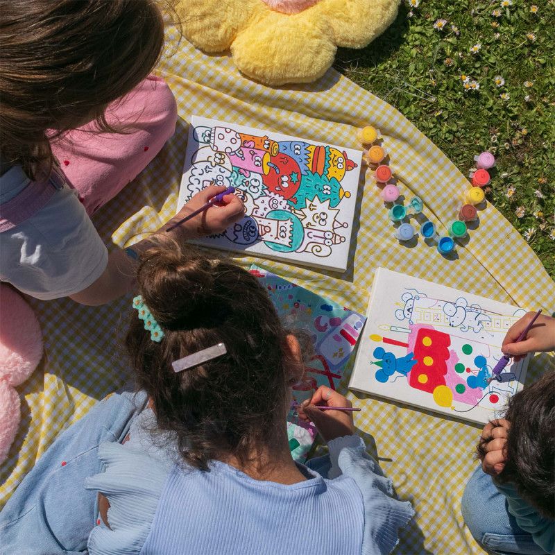 - Contenu : 1 pinceau ergonomique, 11 godets de peintures à l'eau refermables, une nappe adhésive de protection, une toile 18 x 25 cm à peindre