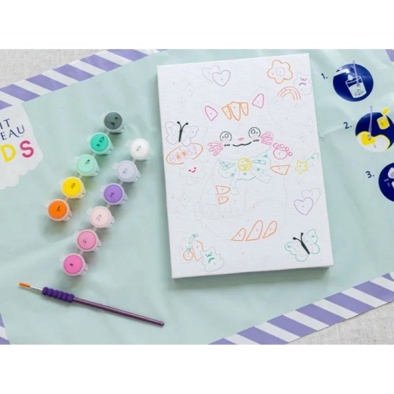 - Contenu : 1 pinceau ergonomique, 11 godets de peintures à l'eau refermables, une nappe adhésive de protection, une toile 18 x 25 cm à peindre
