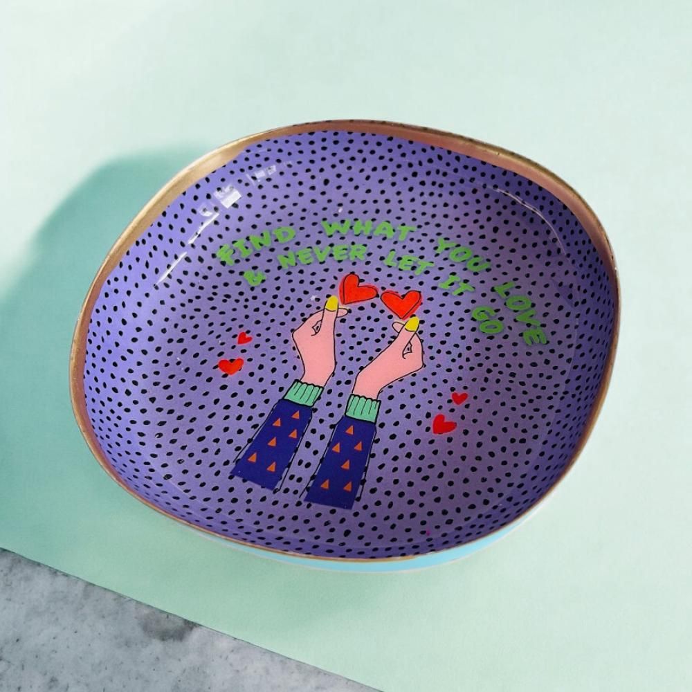 Le ravissant petit plateau "2 coeurs" enchante par son imprimé coloré, encadré par un bord doré peint à la main.