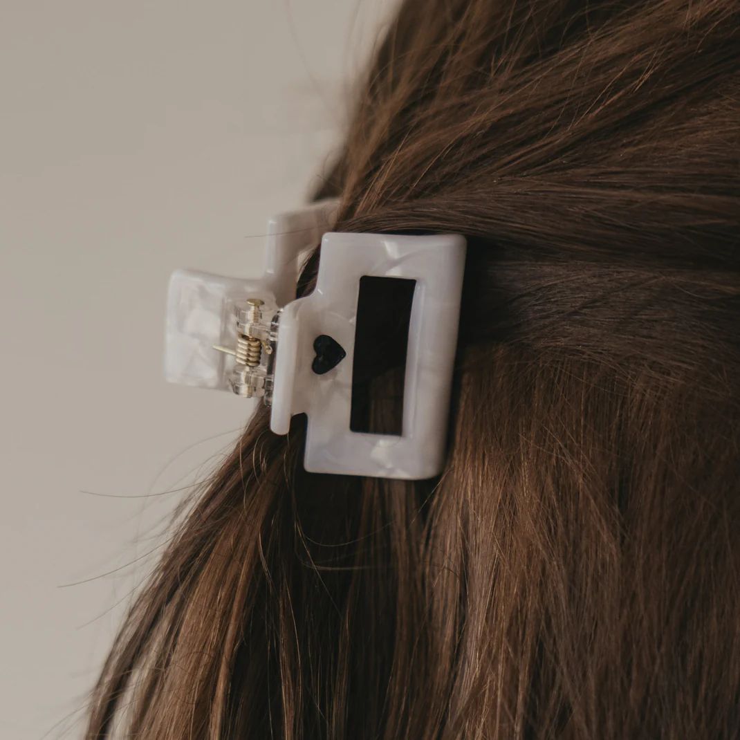 Cette petite pince carrée allie élégance stylée et fonctionnalité pratique. Elle séduit par son élégante texture nacrée et son discret cœur noir.