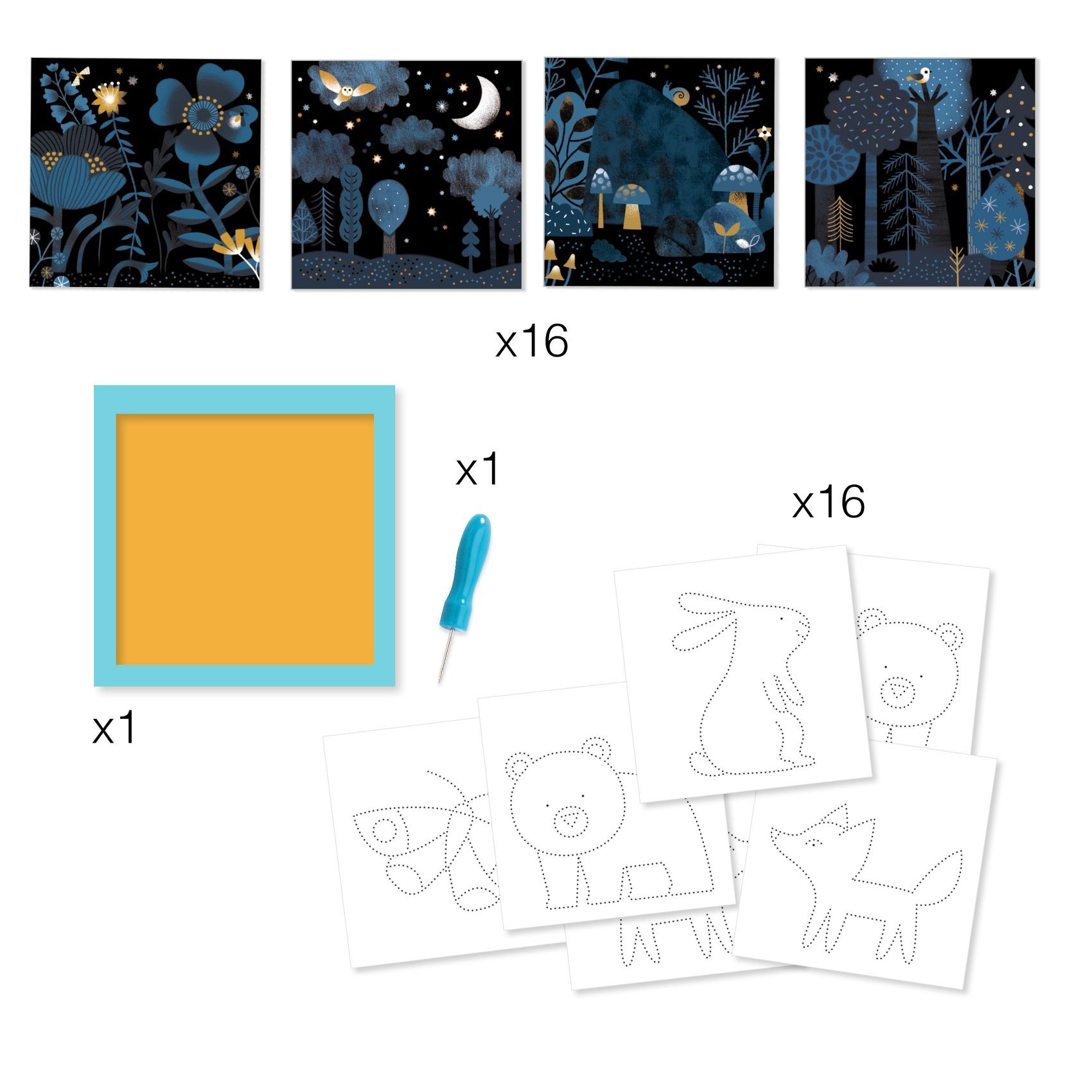 L'enfant choisit un fond et l'animal qu'il souhaite faire apparaître. Il bloque ensuite les 2 feuilles dans le support. À l'aide de l'outil, il picote en suivant les points des trames. L'enfant place une source lumineuse derrière son fond : surprise, l'animal apparait!
