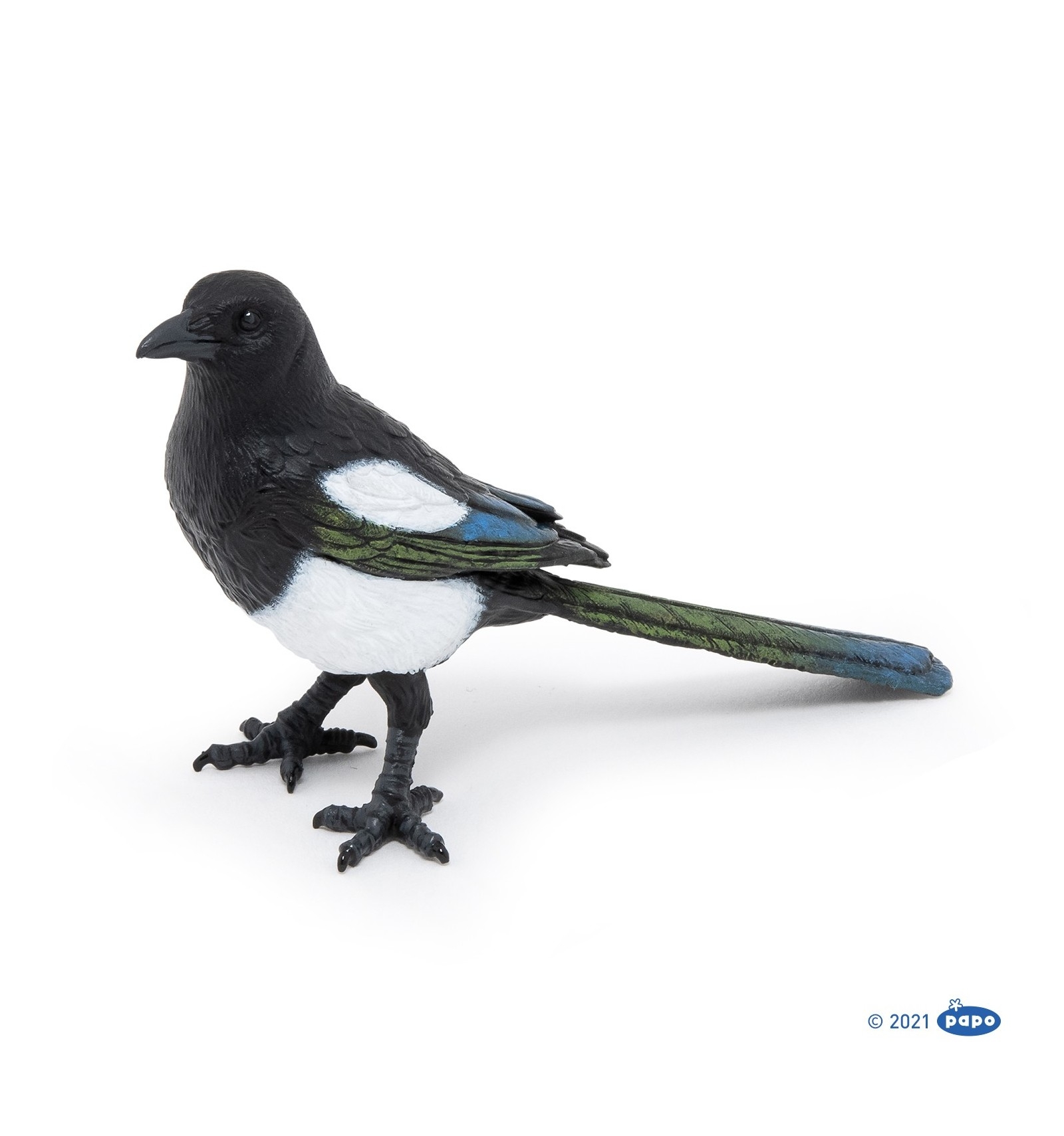 La pie de Papo est oiseau d'assez grande taille est facilement reconnaissable grâce à son plumage blanc et noir et sa longue queue caractéristique. On l'a dit bavarde à cause de son cri, hardie car elle s'approche des habitations et reste au sol pour se nourrir tout en étant méfiante prête à s'envoler au moindre bruit. Grâce à son bec épais et puissant elle fouille la terre pour y trouver ses petites proies.