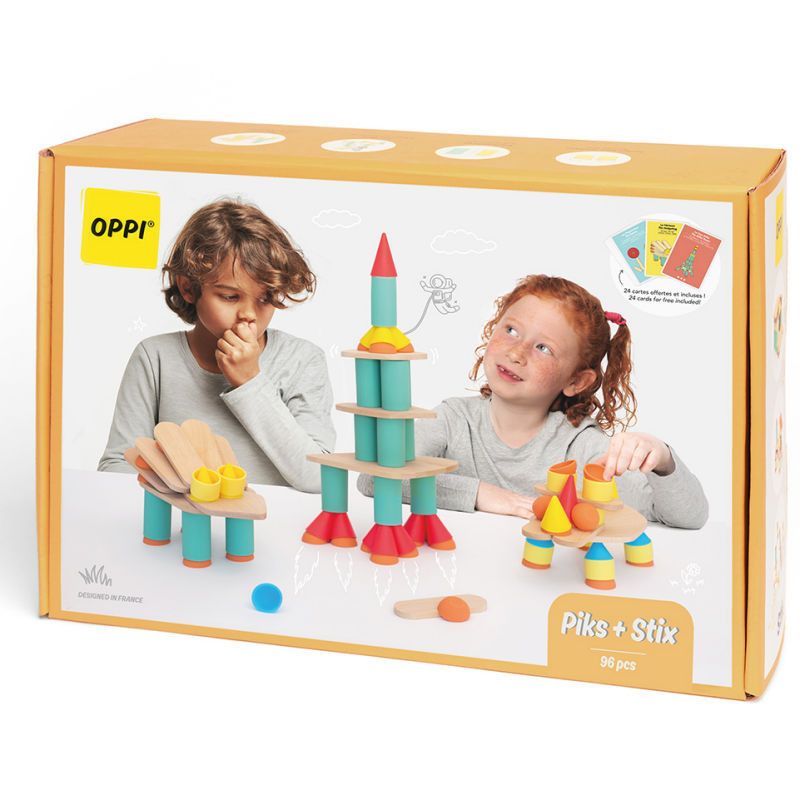 Ce jeu innovant et fusionne deux concepts complémentaires - Piks et Stix - conçus spécialement pour se combiner ensemble de manière intuitive et créative. Grâce à ses éléments variés - pièces en silicone (non-toxique) et planchettes en bois massif naturel - les enfants construisent en équilibre et en volume, développant leur précision, leur logique et leur imagination. Parfaitement compatibles en termes de tailles et de proportions, les pièces Piks et Stix s'unissent pour ouvrir un champ de création sans fin, où l'imagination devient la seule limite...