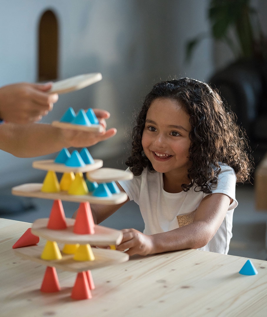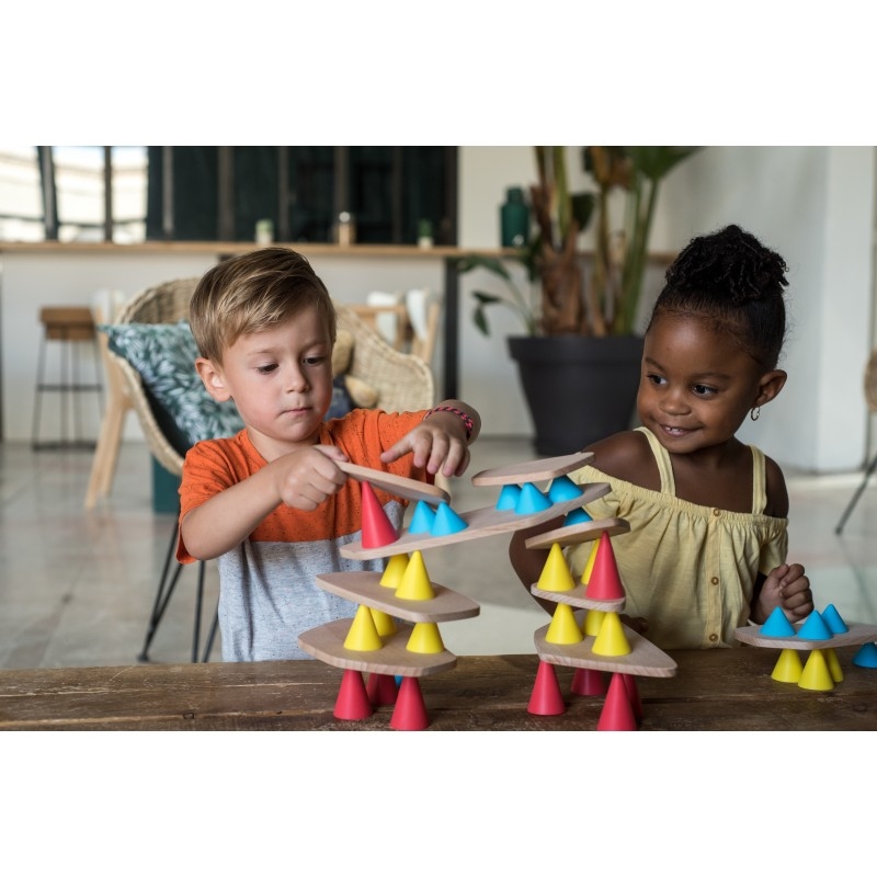 Avec Piks, les enfants explorent les subtilités de l'équilibre tandis que la prise de décision, la motricité fine et l'imagination transforment les joueurs en de véritables artistes en pleine performance de concentration.