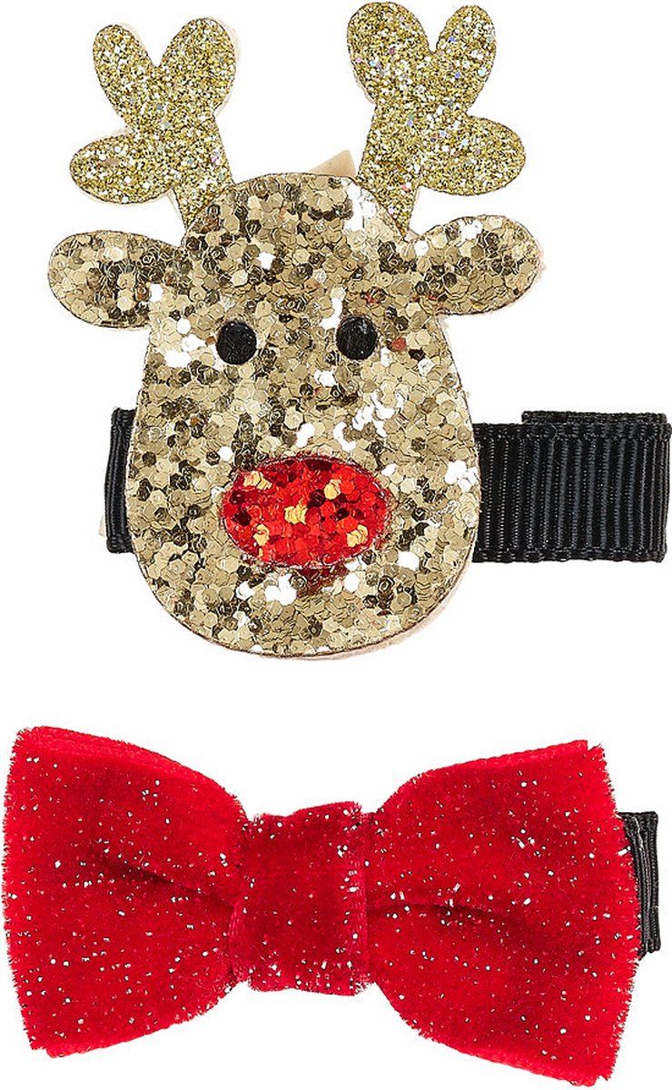 Ajoutez une touche de fantaisie à votre look de Noël avec le lot de pinces à cheveux Renne qui contient une pince avec un gros noeud rouge pailleté et une pince avec un gros renne doré tout mignon