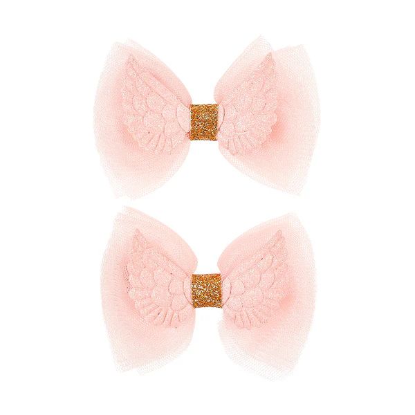 Un joli set de 2 pinces à cheveux ornées de grandes ailes d'ange brillantes.