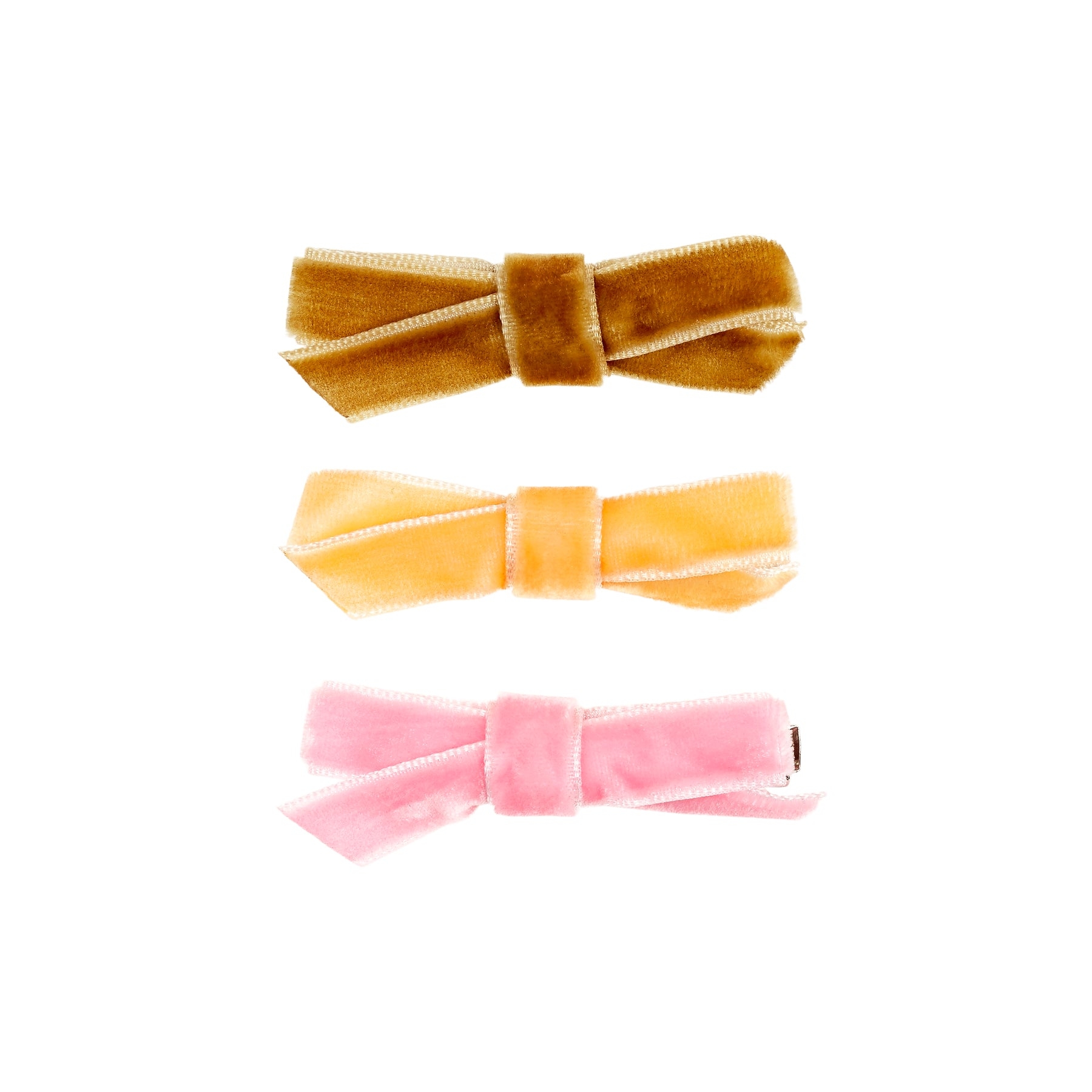 Un joli set de 3 pinces crocodiles à cheveux ornées de nœuds en velours.