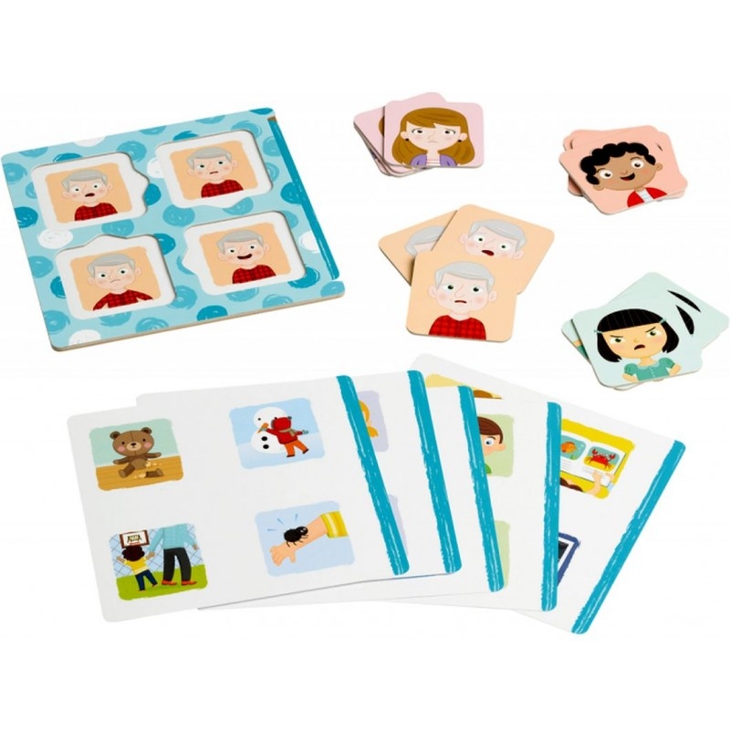 Contenu : 6 planches de jeu recto-verso, 16 cartes-émotions recto-verso, 1 gabarit pour insérer les planches de jeu, 1 guide d'accompagnement et les règles du jeu.