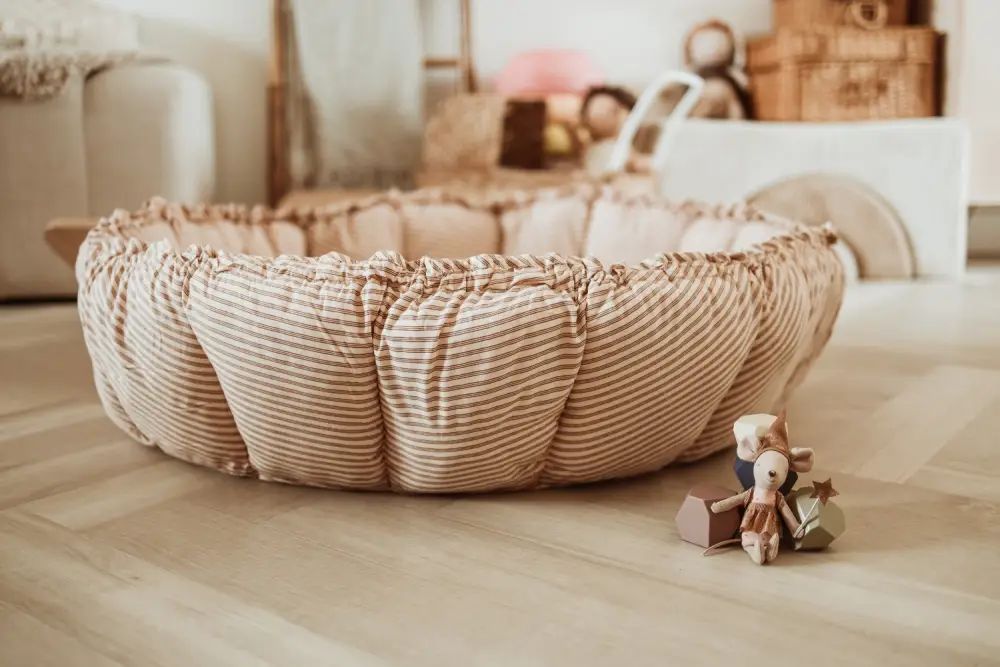 Les pétales se redressent grâce à un système de ficelles que l'on tire, une action simple qui se réalise en moins d'une minute pour passer du tapis au panier. Confortable et moelleux c'est un produit idéal pour les premiers mois de bébé. Son tissu en coton biologique et son rembourrage polyester recyclé apporte confort et douceur tout en respectant l'environnement. Un produit tendance grâce à son design épuré.