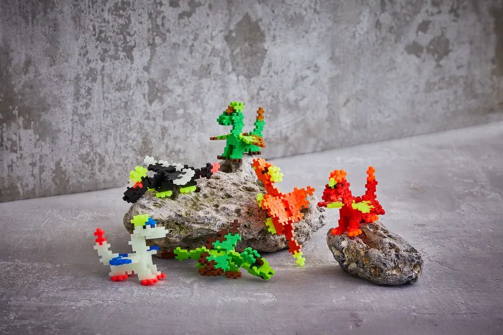 Créez votre dragon lumineux avec Plus-Plus ! Couleurs électriques et phosphorescentes, voyagez au temps des châteaux forts et des créatures mythiques.