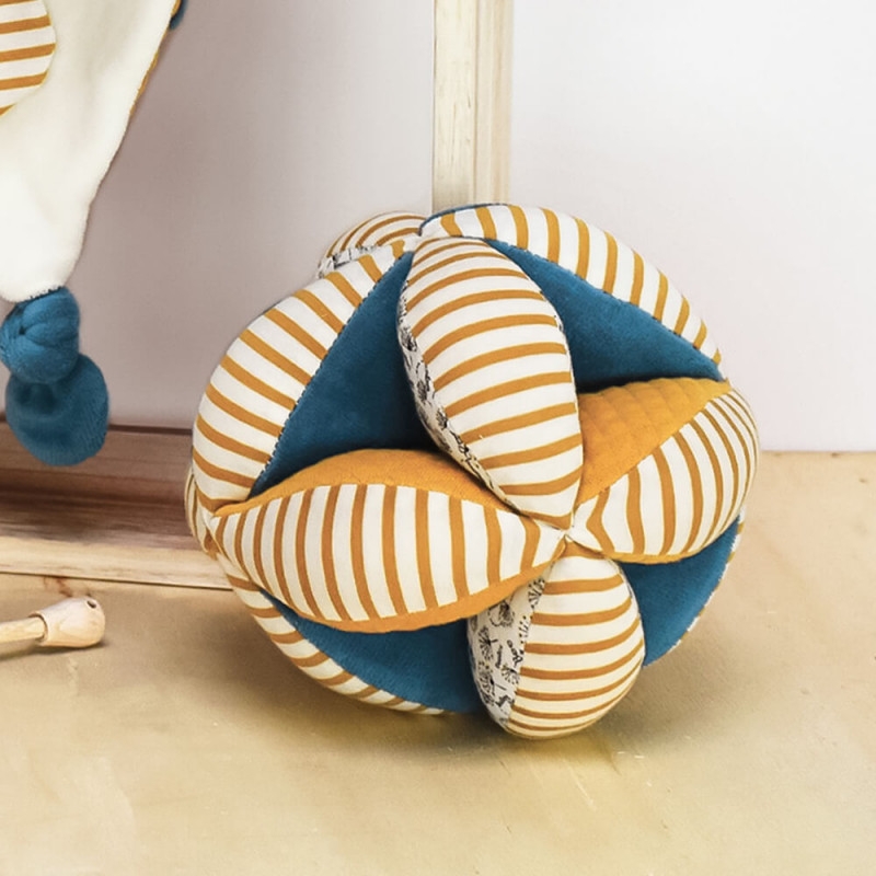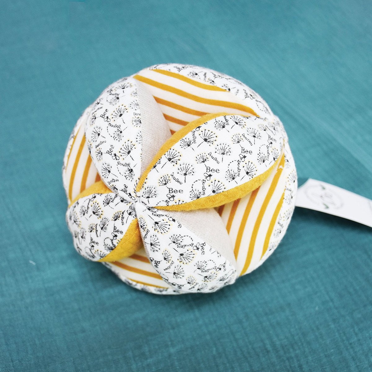 Créée pour accompagner le développement des tout-petits, la Balle de préhension Pollen l'abeille de Doudou et Compagnie est composée de 12 coussinets moelleux, servant de petites poignées adaptées à la taille des mains de bébé et comprend un hochet.