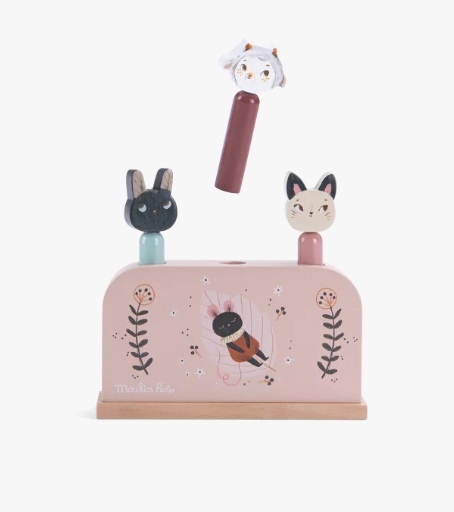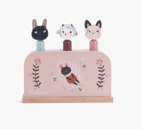 Découvrez le pop up de la collection Après la pluie de Moulin Roty, un jouet d'éveil en bois très coloré pour amuser les enfants. Le lapin, la chèvre et le chat rose, prêts à sauter partout !