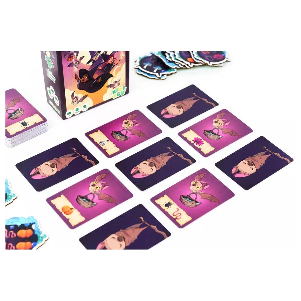 Contenu : 50 cartes chauve-souris recto/verso, 4 tuiles « baguettes magique », 12 tuiles « chaudron de potion magique »