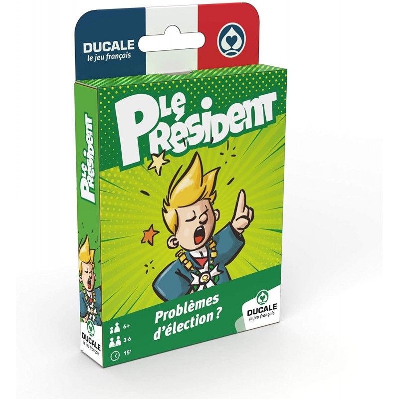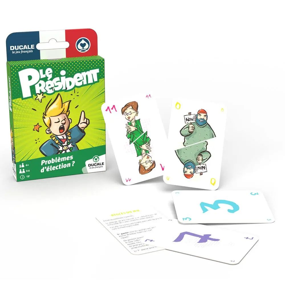 (Re)découvrez les règles du jeu du Président avec les cartes spécialement redessinées pour l'occasion ! Le but est de se débarrasser de l'ensemble des cartes avant les autres joueurs. La carte 12 est la carte la plus puissante du jeu, la carte 0 étant la plus faible. Le premier à poser son jeu sera « Président » et le dernier « je vous laisse deviner...