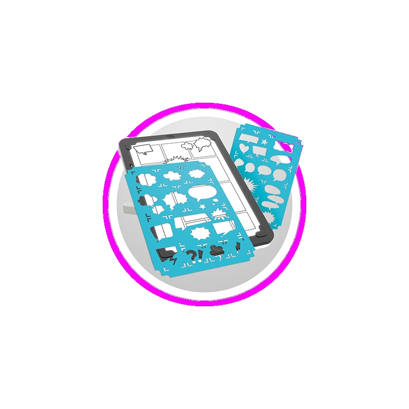 Fonction BD/Manga : Place une feuille, utilise les pochoirs pour créer tes planches vierges puis dessine, ajoute des stickers et créé tes histoires.