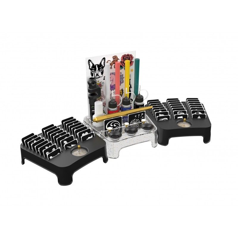 Avec un stylo, pour dessiner à main levée comme les professionnels, ou en tamponnant de l'encre au travers de pochoirs, votre enfant pourra réaliser de jolis tatouages et travailler comme un véritable tatoueur.