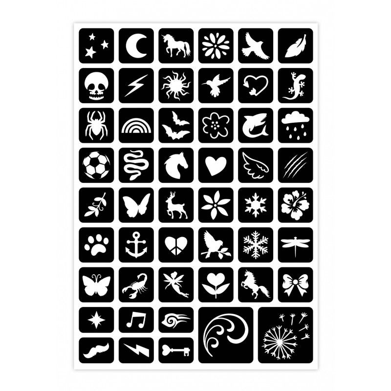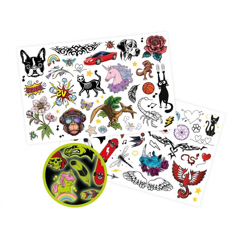 Il pourra faire briller ses créations en ajoutant des paillettes ou utiliser les feuilles de tatouages temporaires incluses pour réaliser des tatouages colorés qui brillent dans le noir.