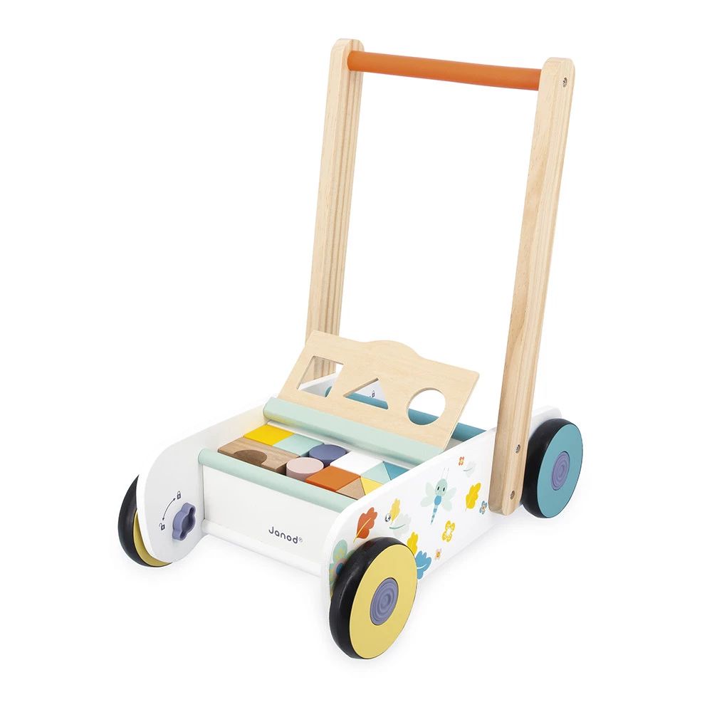 Ce joli chariot aux illustrations inspirées de la forêt accompagne les bébés dès 1 an dans l'apprentissage de la marche et dans leurs découvertes. Grâce à une boîte à formes présente au cœur du chariot, les tout-petits s'amusent à insérer les 18 blocs en bois dans les emplacements dédiés. Une activité ludique qui permet d'apprendre les formes, mais aussi les couleurs tout en développant la motricité fine et la dextérité. Une partie rangement est même intégrée au chariot !