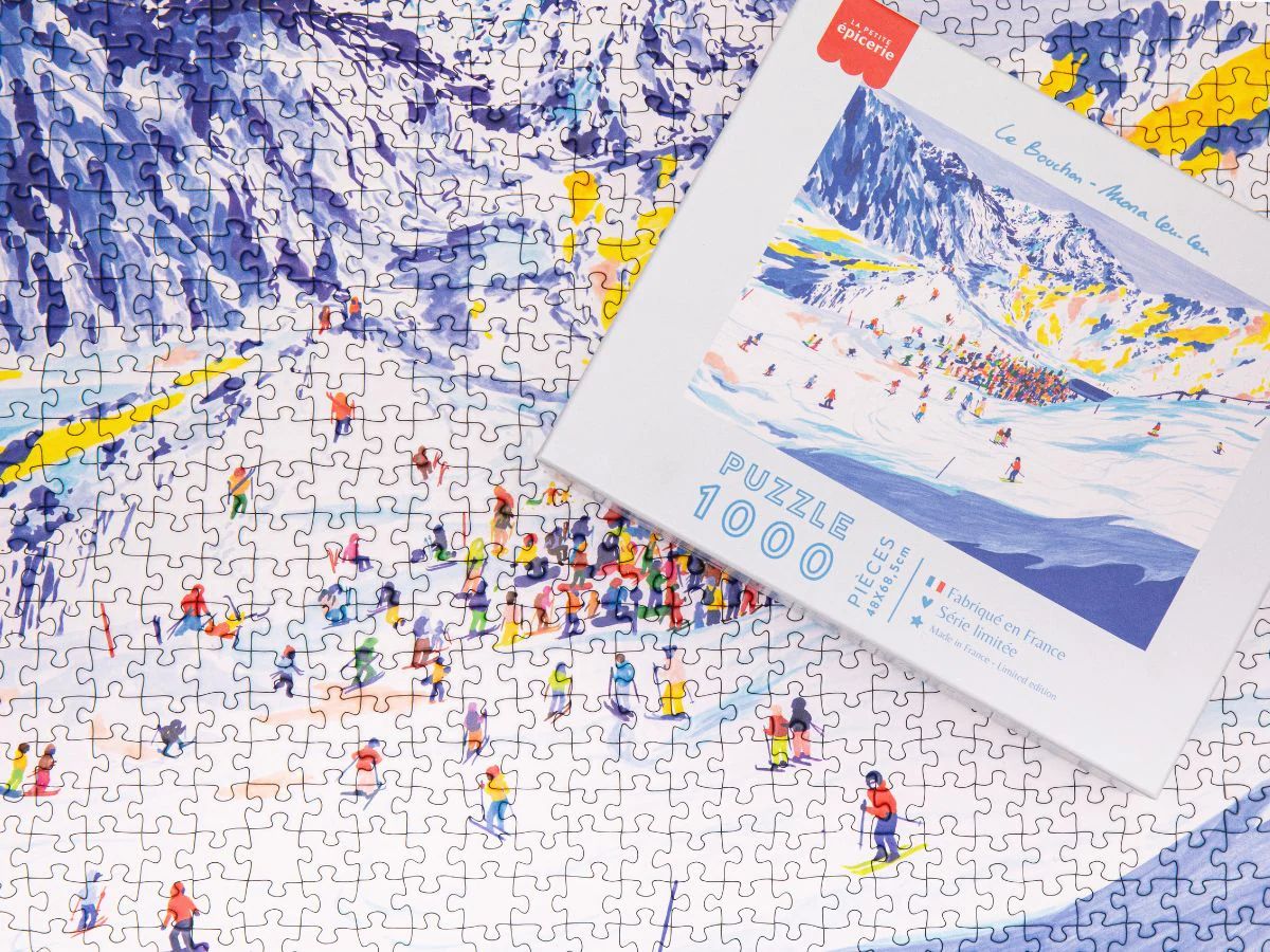 Embouteillage sur les pistes ! Le Bouchon met en scène avec humour les joies de la montagne en haute saison. Dans cette illustration décalée de Mona Leu Leu, skieurs, télésièges et chalets s’entremêlent dans une joyeuse pagaille enneigée. Chaque pièce révèle des détails malicieux, pour un moment de détente à la fois drôle et immersif.