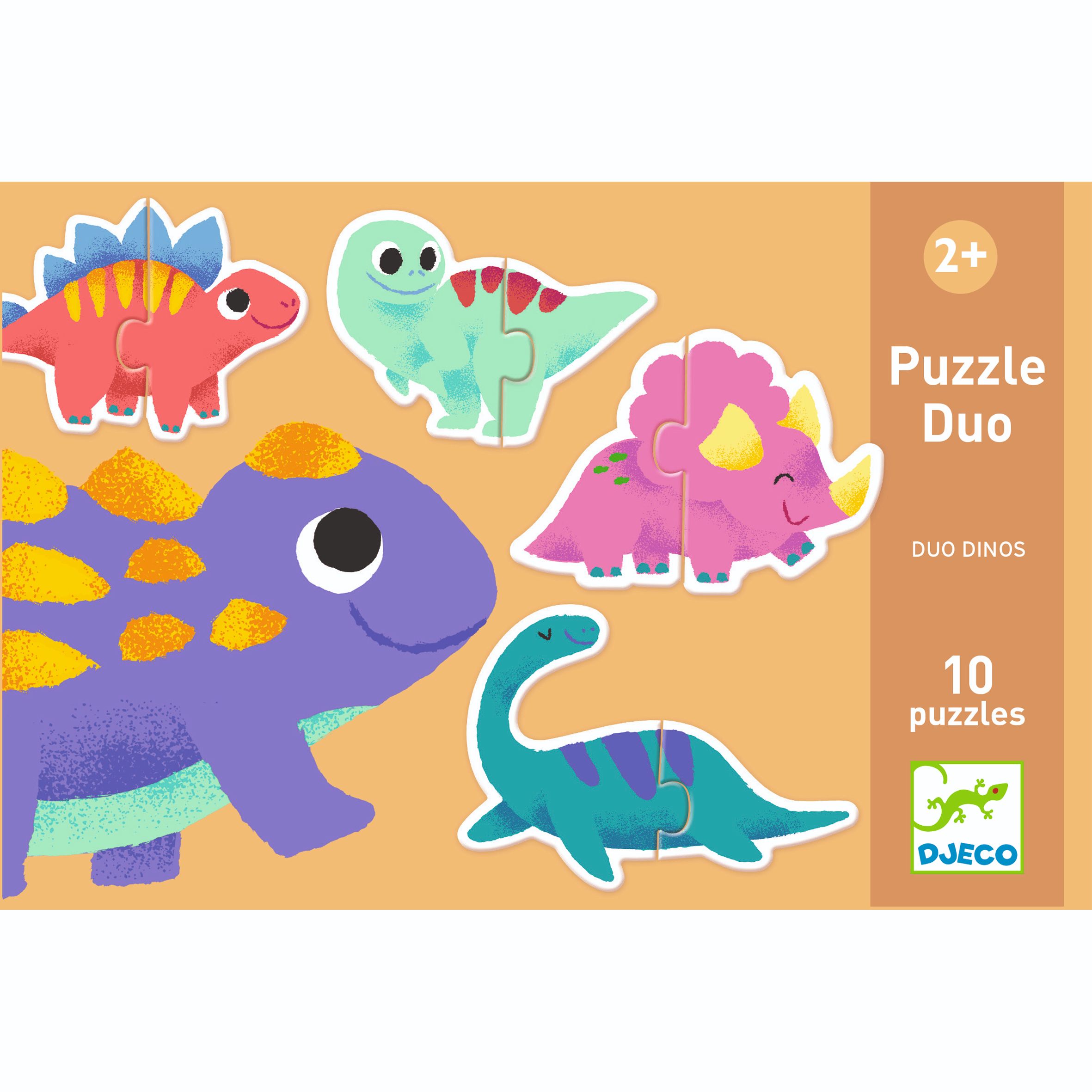 « Puzzle duo _ Duo Dinos » contient 10 puzzles silhouettés en forme de dinosaures, chacun composé de 2 pièces.