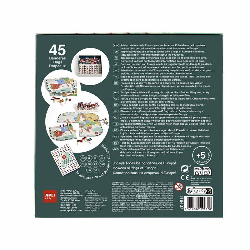 Comprend 1 plateau avec la carte de l’Europe, 45 drapeaux des différents pays et 1 livret explicatif avec le drapeau et les données pertinentes de chaque pays en 10 langues différentes : le nom du pays, sa superficie, sa population, sa capitale, sa monnaie, sa langue.