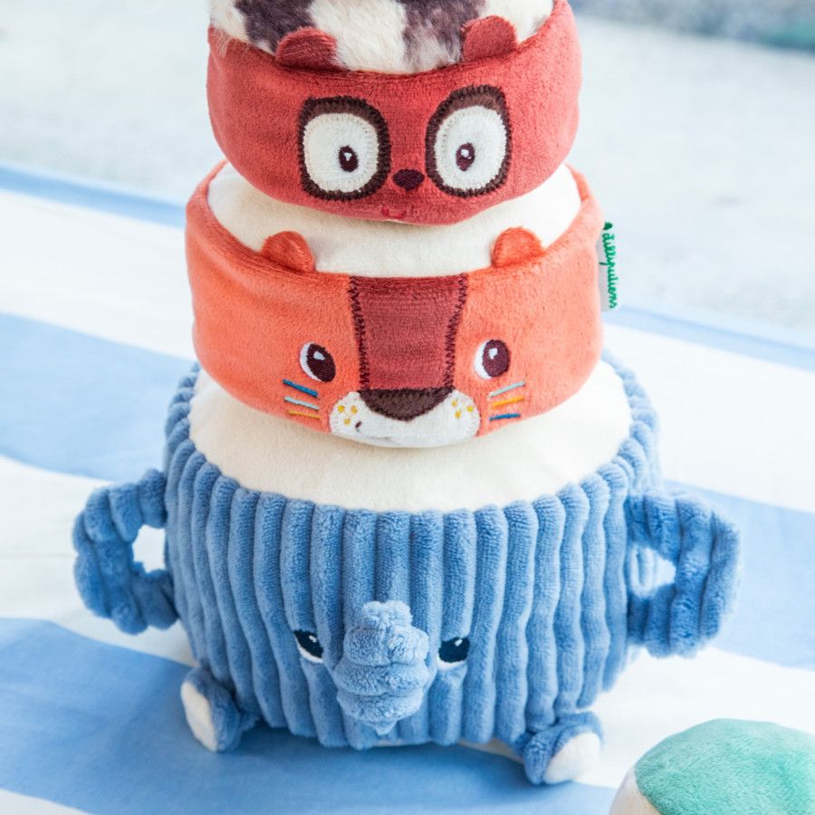 Bébé empile un à un les 4 animaux en tissu pour construire une tour sensorielle pleine de surprises. En manipulant les peluches, il pourra explorer diverses matières.