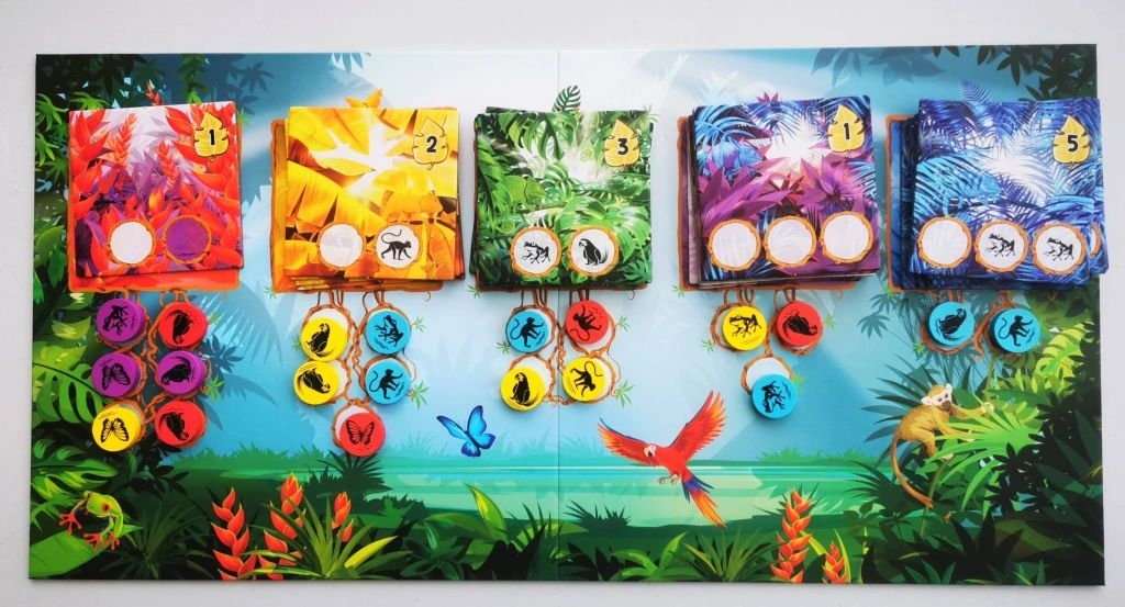 Contenu : 1 plateau central, 4 plateaux personnels, 55 tuiles Jungle, 10 jetons Zone protégée, 4 jetons Equilibre, 1 jeton Jumelles, 112 jetons Espèce, 1 sac en tissu et la règle du jeu