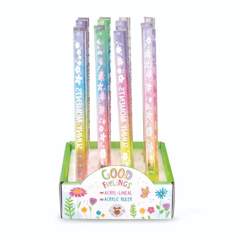 Pour plus de bonheur ! Cette règle en acrylique, au dégradé arc-en-ciel transparent et à l'élégant imprimé argenté, offre une prise en main confortable et est pratique grâce à sa forme triangulaire. Un véritable accroche-regard sur votre bureau !