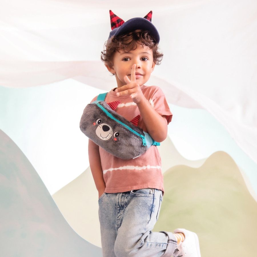Ce sac banane tout doux, complètera les tenues de vos bouts de chou. Louis le loup coquin protège et veille aux trésors dans ce sac.