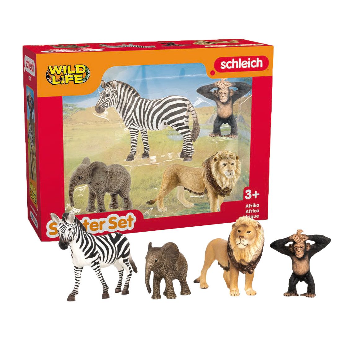 Contenu : 1 x lion, 1 x zèbre, 1 x éléphanteau d’Afrique, 1 x jeune chimpanzé