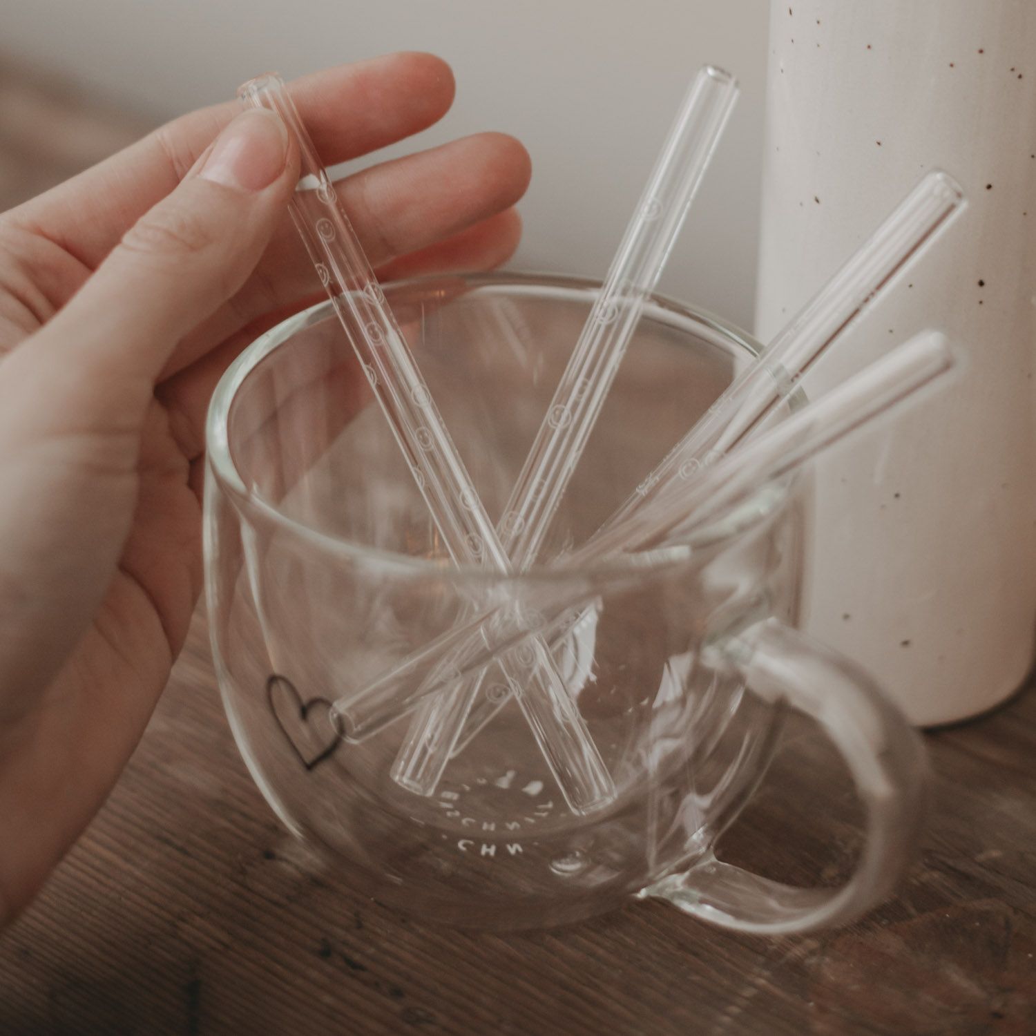 Les pailles Smileys en verre apportent beaucoup d'énergie positive à ton verre ! Sur toute la surface, les pailles sont décorées de petits smileys gravés avec amour, qui donnent à chaque boisson une note joyeuse et gaie. De haute qualité, résistantes à la chaleur, elles sont une alternative écologique aux produits jetables.