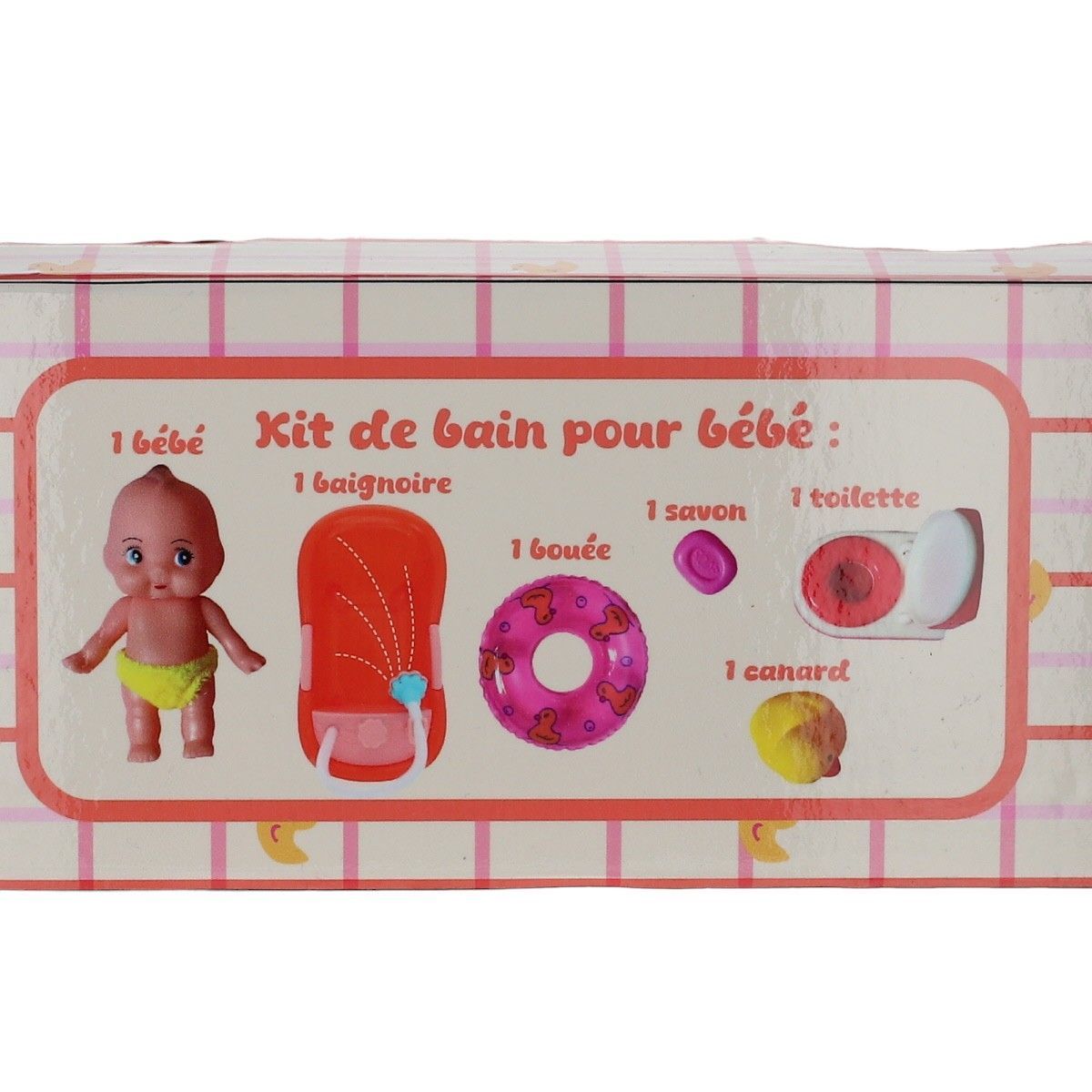 Contenu : un mini poupon avec sa couche amovible, une baignoire, un toilette WC, un canard, une bouée gonflable, un savon.