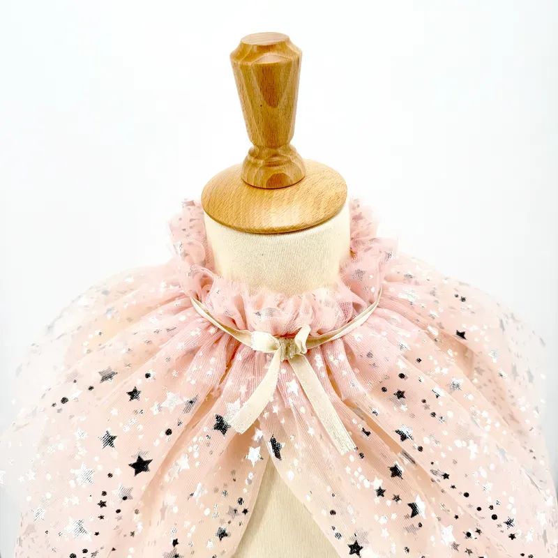 Le set Tutu et Cape Loane couleur Rose poudré est composé d’un tutu en tulle avec impression d’étoiles dorées et d’une cape assorties.