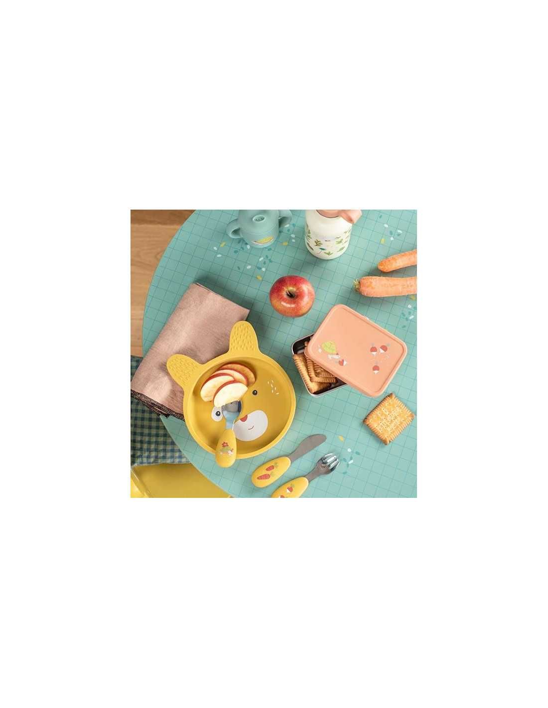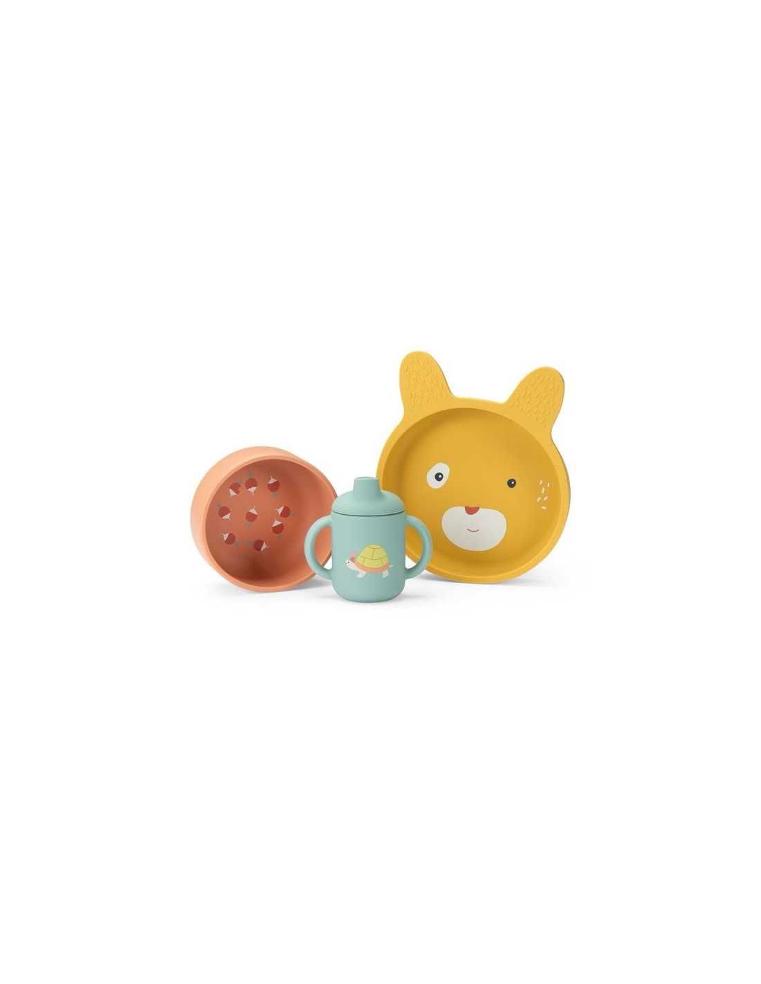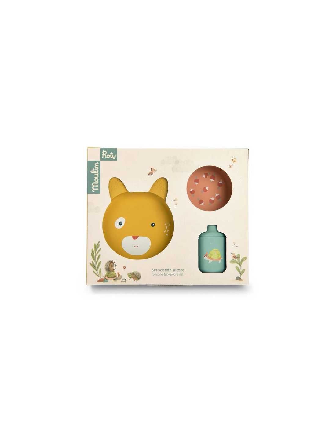Ce set de vaisselle en silicone de la collection Trois petits lapins de chez Moulin Roty se compose d'une assiette, d'un bol et d'une tasse d'apprentissage pour aider les tout-petits à boire en autonomie.