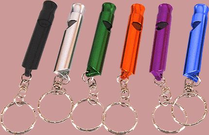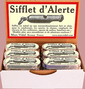 Bien rangé dans sa petite boîte, voilà un élégant sifflet d'alarme et de jeux aux belles couleurs.