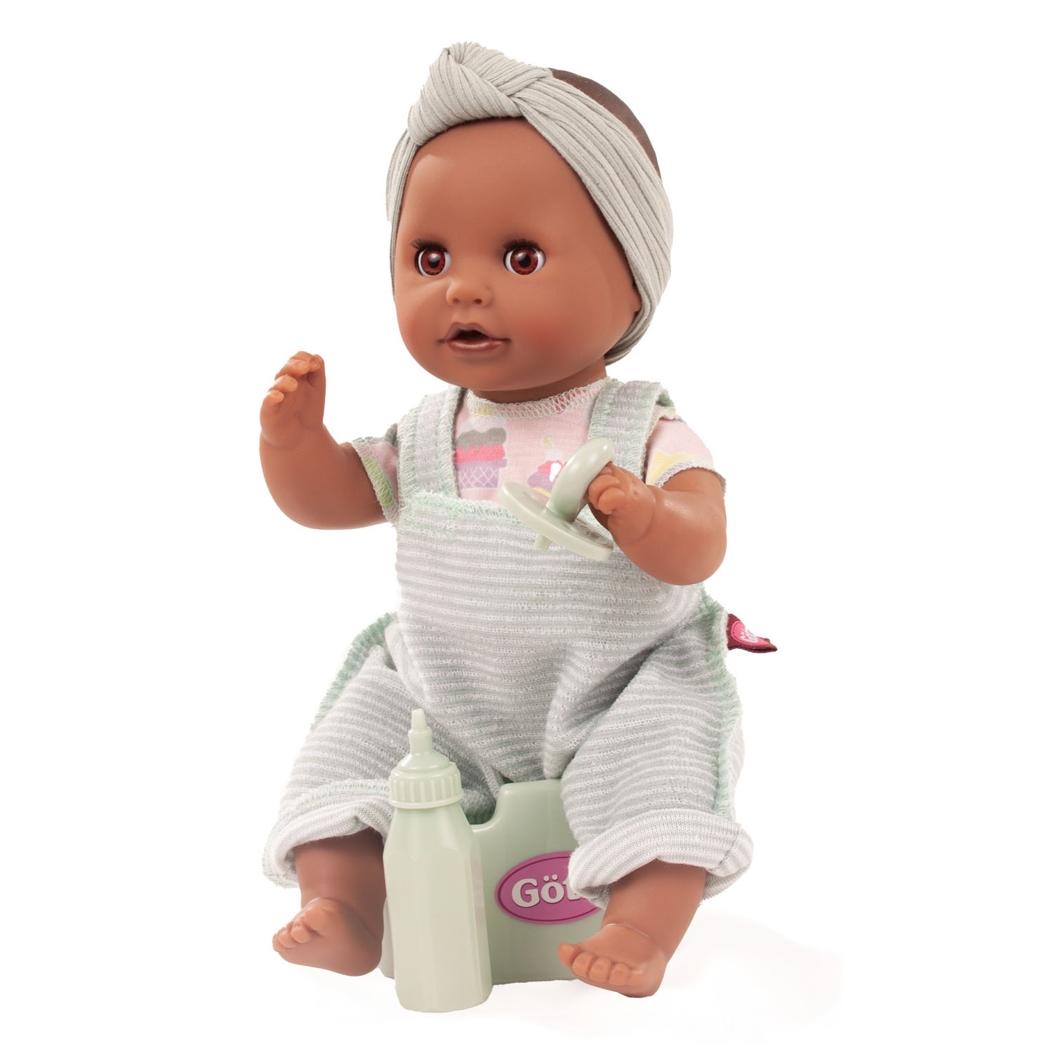 Ce joli poupon en position assise de 33 cm est vêtu d'un t-shirt rose motif crème glacée, d'une salopette rayée blanc et vert et d'un bandeau vert uni. Il est livré avec un petit pot, un biberon et une sucette.