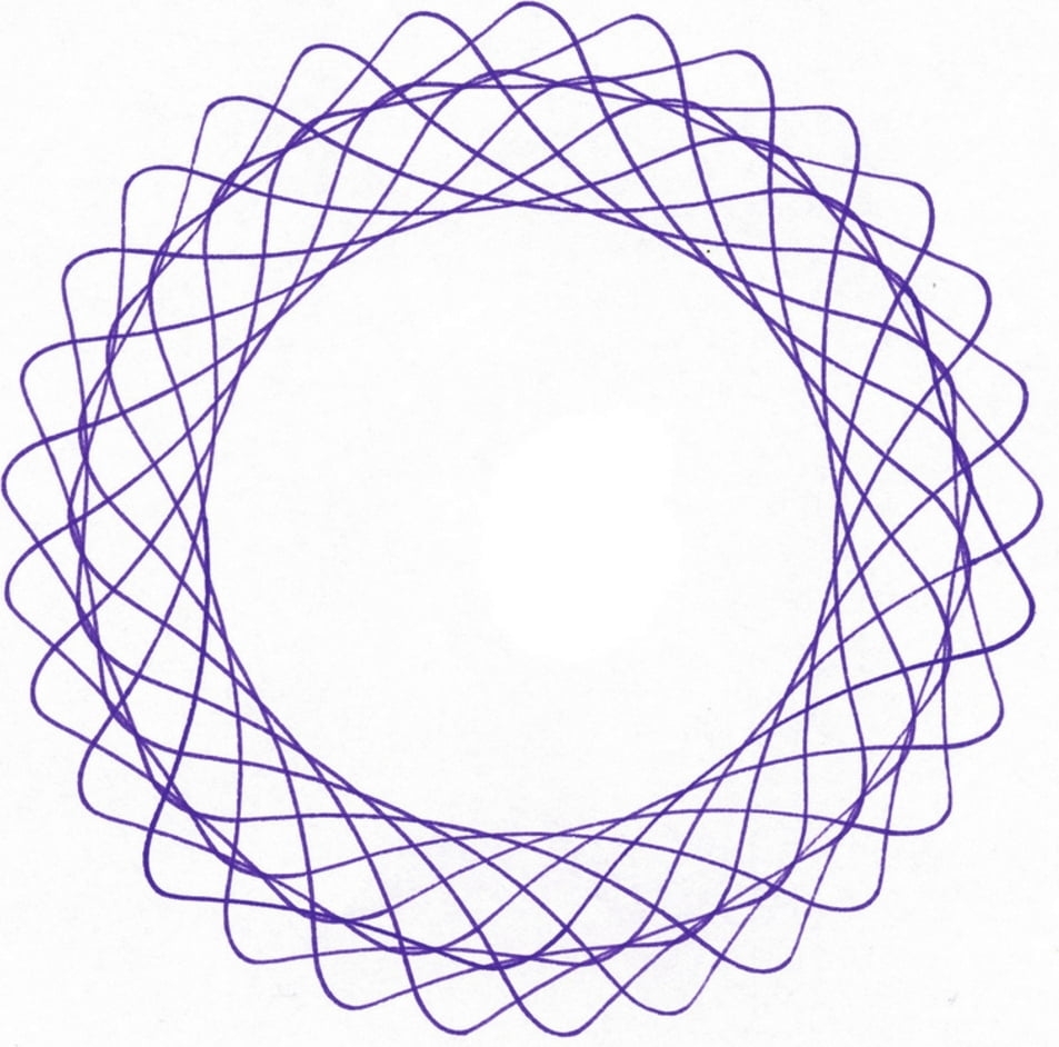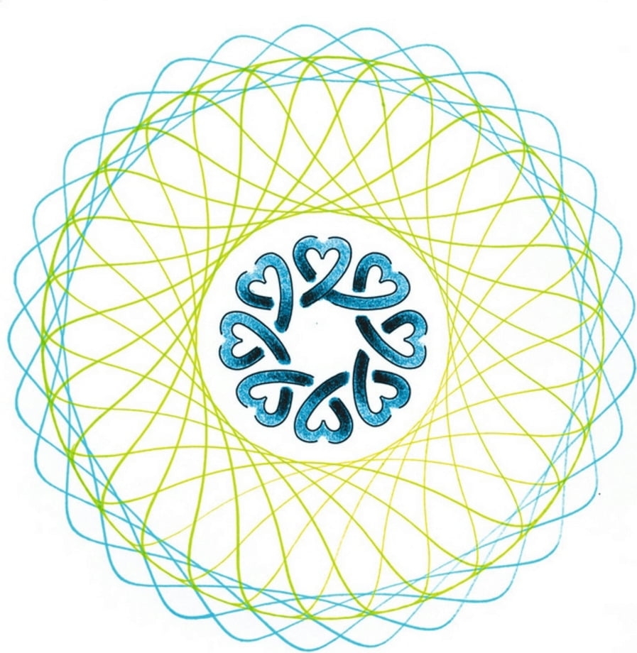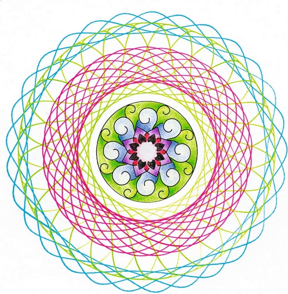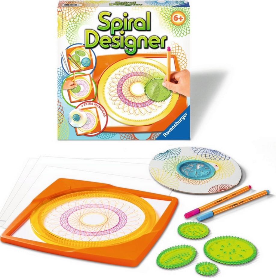 Contenu : 1 pupitre, 1 anneau cranté, 4 roues crantées, 1 disque pour le pochoir à mandalas, 1 pochoir à mandalas, 10 feuilles de papier, 2 stylos feutres et 1 mode d'emploi