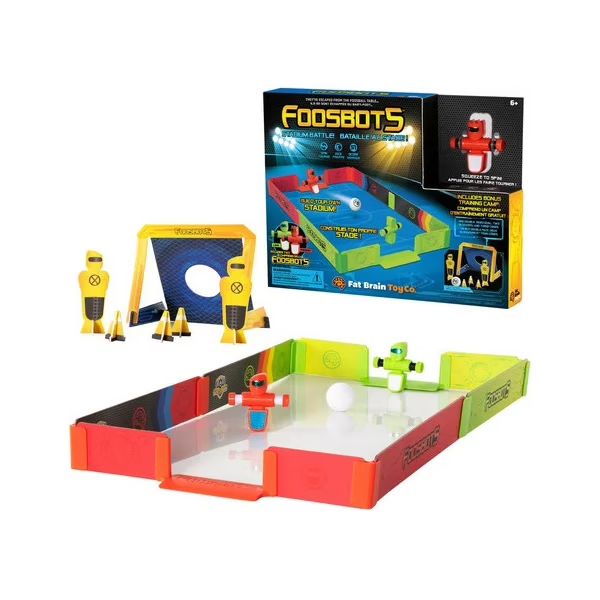 Vivez l'excitation des tournois avec Foosbots Stadium Battle, la table de baby-foot qui vous permet de construire votre propre arène et de vous battre avec des foosbots plus vrais que nature.