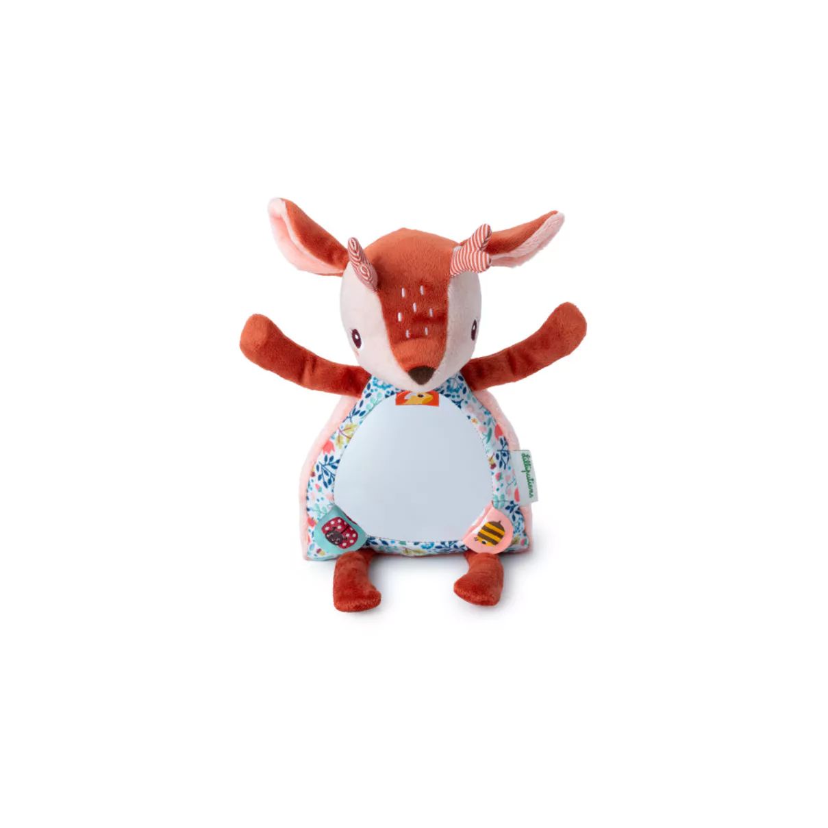 Avec ses mains aimantées, Stella le faon peut se cacher les yeux pour jouer à cache-cache avec l'enfant, suscitant rires et émerveillement. Sur son ventre, un grand miroir invite l'enfant à découvrir son propre reflet, stimulant ainsi son éveil sensoriel et sa découverte de soi.