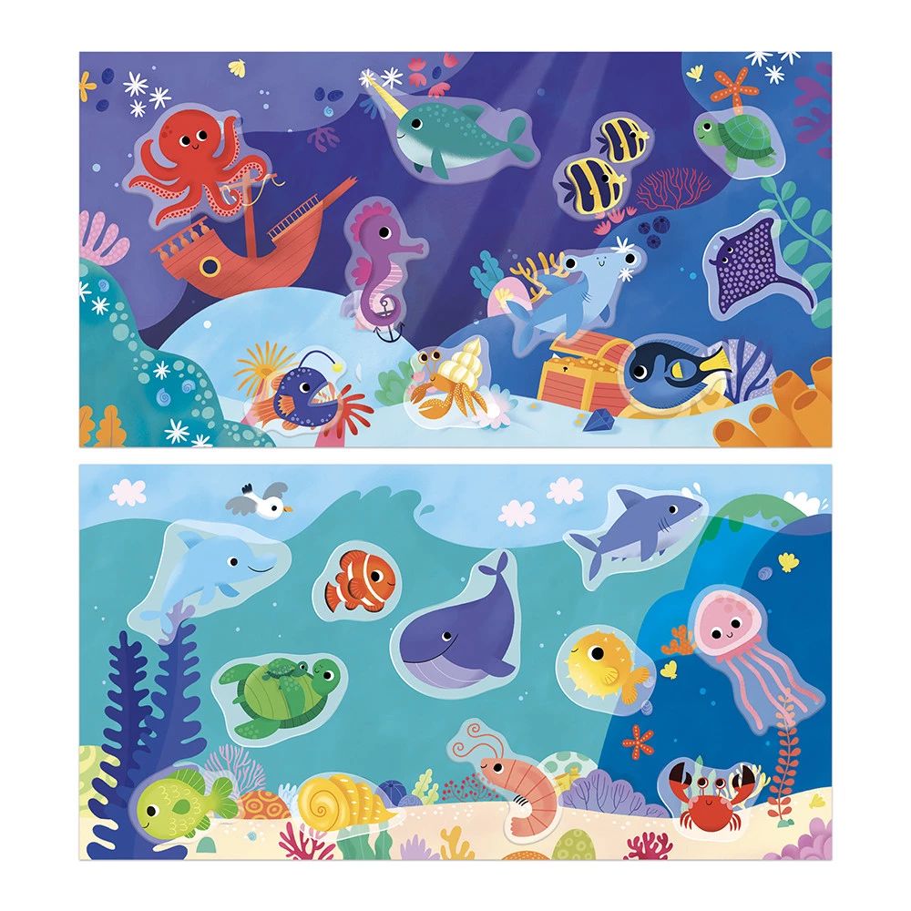 La pochette propose un décor recto-verso grand format pour varier les histoires : un fond marin en plein jour d’un côté, et une scène nocturne mystérieuse de l’autre. Les 30 stickers épais représentent tout types d'animaux marins : crabe, poisson rouge, baleine, etc..